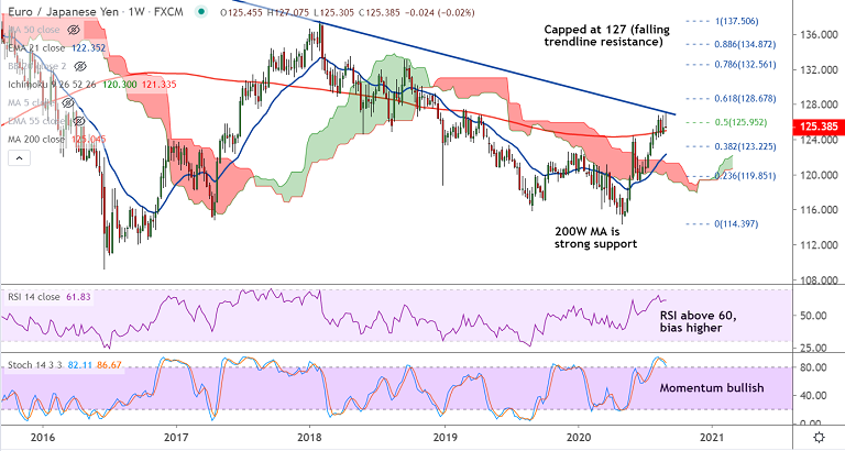 Major trend in the pair is bullish, but stiff resistance is seen at 127 levels (major falling trendline). Breakout at 127 mark will see further gains.