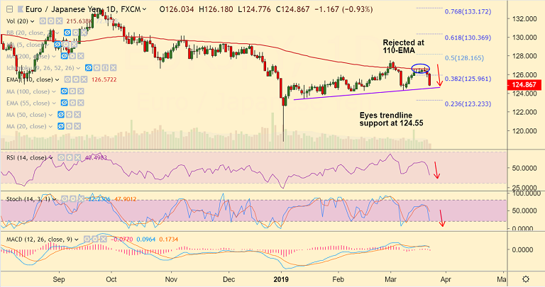 - The pair has slipped below 50-DMA at 125.30 and is hovering around trendline support at 124.55.