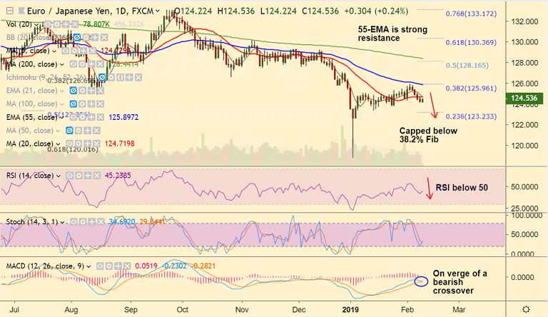 - On the flipside, we see little support till lower Bollinger band at 123.79. Further weakness to see test of 123.39 (Jan 15 low) ahead of 120.01 (61.8% Fib)