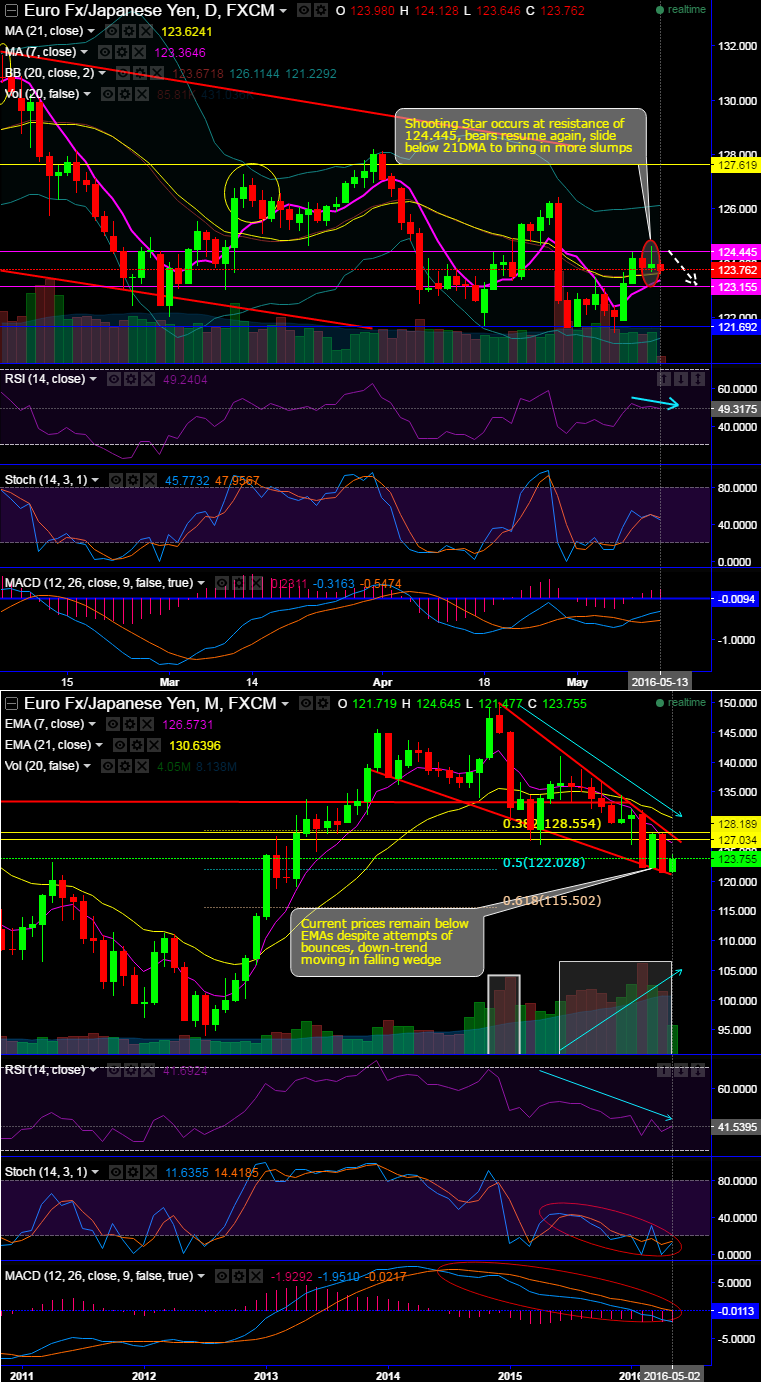 A “Shooting Star” pattern occurs at resistance of 124.445, as a result, we see bears resuming again, current prices testing supports at 123.6212 (21DMA), slide below 21DMA to bring in more slumps.