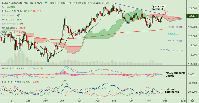 Summary: Euro appreciates across the board. Positive market sentiment amid promising COVID-19 vaccine news and upbeat data translates into solid advances for the pair. Eurozone macroeconomic figures have also beaten expectations. The German IFO business climate survey and third quarter’s GDP have shown better than expected readings. Bullish technical setup aids further upside in the pair. Cloud offers immediate hurdle at 124.72. Scope for test of 200W MA at 125.19 on break above.