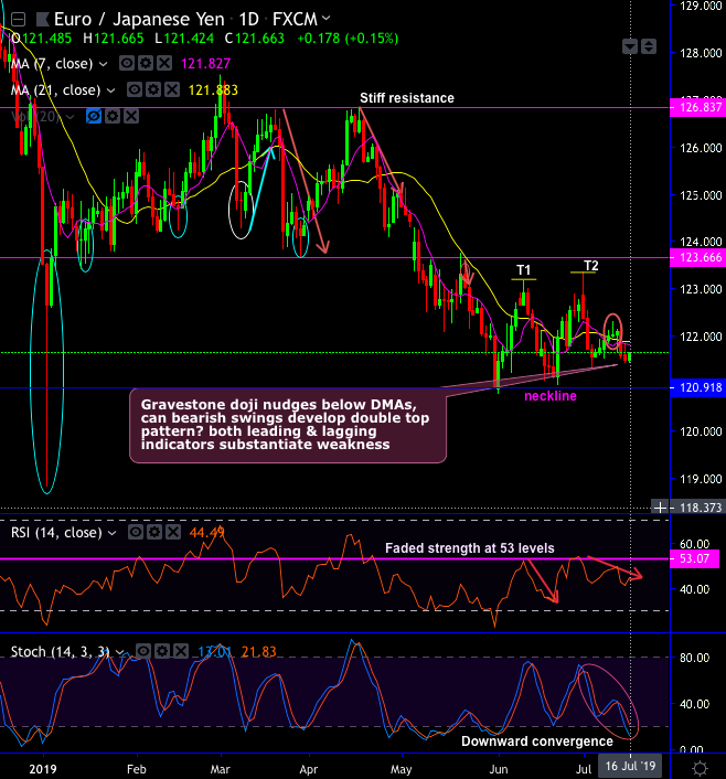Technical chart and candlestick patterns formed: On EURJPY daily plotting, gravestone doji has occurred at 122.020 levels that nudge below 21-DMAs again.