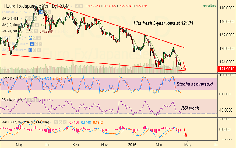 - EUR/JPY hit fresh 3-year lows at 121.71 as yen strength across the board weighed heavily on the pair.