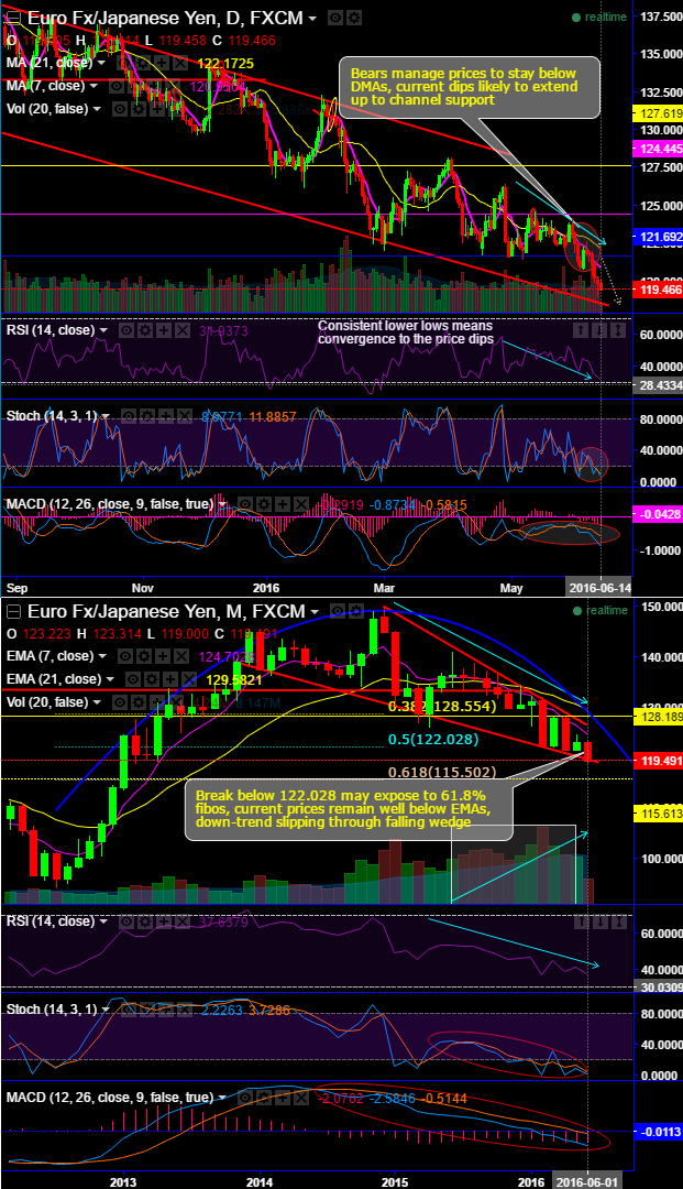 Moreover, the break below 122.028 may also expose to 61.8% Fibonacci retracements, current prices remain well below EMAs, the down-trend has been slipping through falling wedge (see monthly plotting). Hence, it is perceived as on-going downtrend would prevail further.