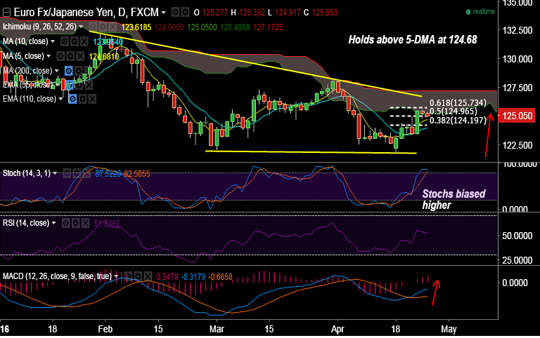 FxWirePro: EUR/JPY holds above 5-DMA at 124.668, weakness only on breaks below