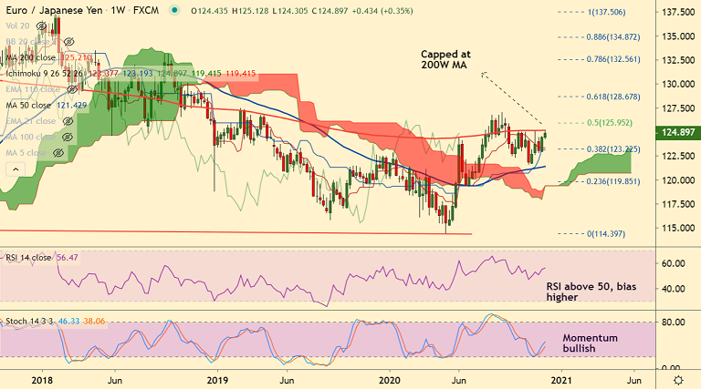 Next hurdle aligns at 50% Fib at 125.95 ahead of 61.8% Fib at 128.67. Failure at 200W MA will negate any further bullishness.