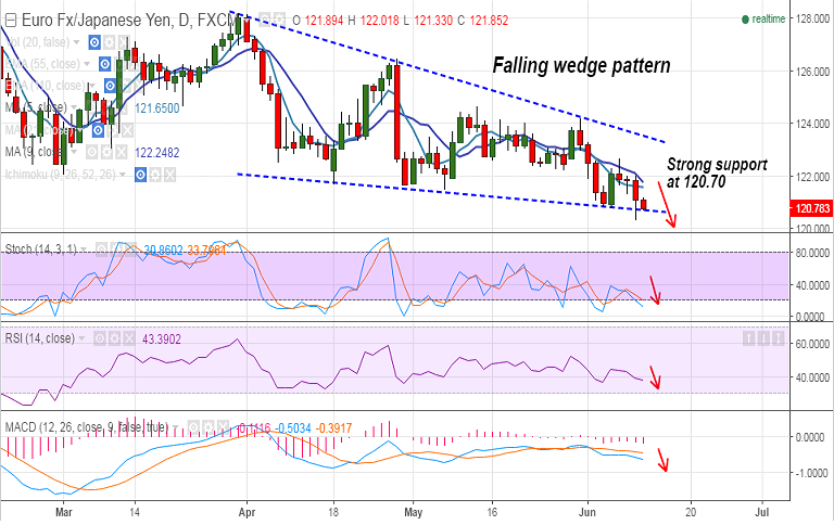 - A falling wedge pattern seen on dailies, major support at 120.70 (wedge base). Break below could see downside to 119.75 and then 119.11.