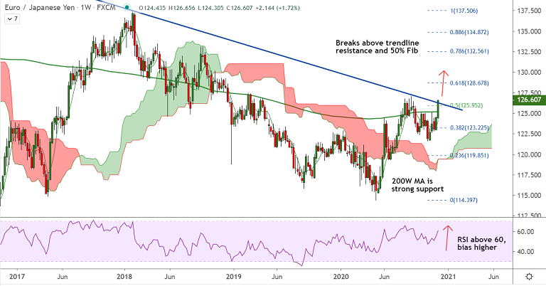 On the weekly charts, the pair has broken crucial resistances at 200W MA and falling trendline at 126.25, confirming further upside.