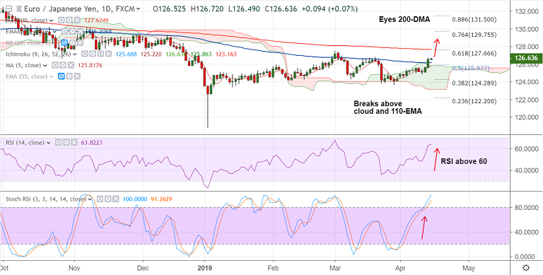 Support levels - 126/ 125.81 (nearly converged 5-DMA and cloud), 124.77 (Apr 10 low)