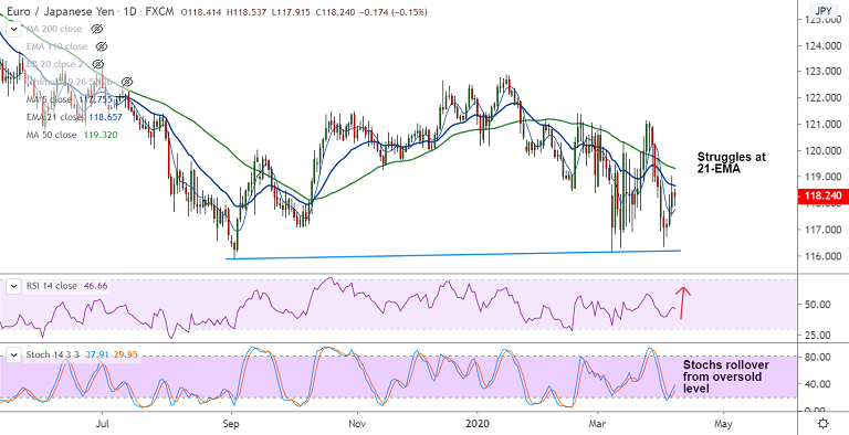 Price action has paused at 21-EMA at 118.65, break above eyes 50-DMA at 119.31. Failure at 21-EMA and retrace below 5-DMA to negate any bullish bias