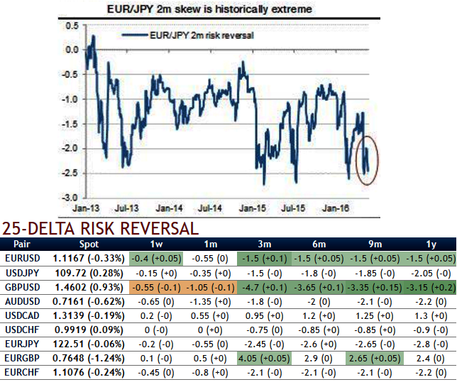 While, the EUR/JPY 2m risk reversal is trading at extreme historical highs in favour of yen calls, close to the peak at -2.5 vols (See above graph) and within this tenor risk reversal strategy encompasses above stated risky events.