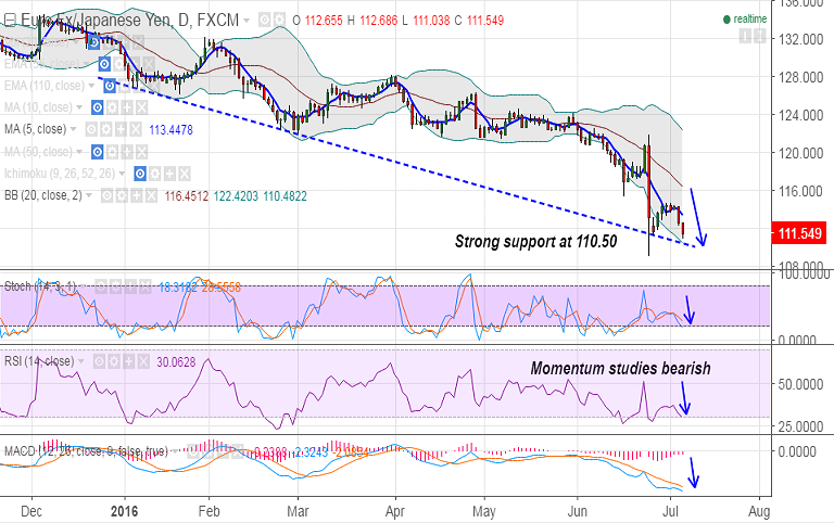 - The pair now finds strong support at 110.50 levels which is trendline support and lower Bollinger Band. Break below will drag the pair lower to 109 levels.