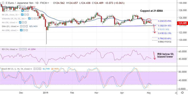 - 5-DMA is immediate resistance at 124.75. Break above 21-EMA negates bearish bias.