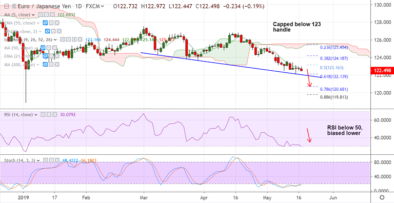 Technical analysis supports weakness in the pair, scope for test of 122 (trendline support).