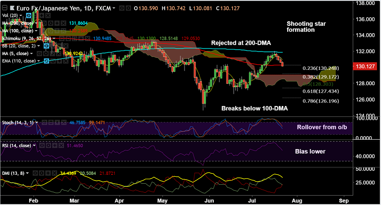 - Price has dipped below 100-DMA at 130.25 to hit session lows at 130.08 levels.