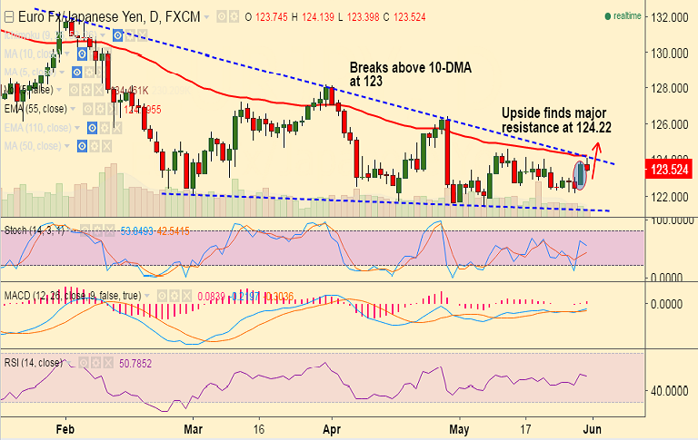 - Supports on the downside are located at 123.08 (converged 5&10-DMA), 122.65 (May 30th lows) and 122.21 (May 27th lows).