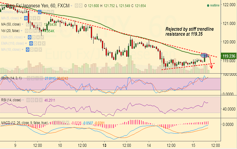 - Upside in the pair finds stiff trendline resistance at 119.35, struggles to break above. Hourly 50-SMA at 119.29 also weighs on the upside.