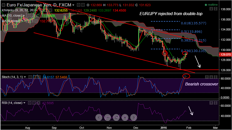 EUR/JPY price action was rejected from double top at 129.47 (Jan 5th and 27th), day's highs were also capped at 129.47.