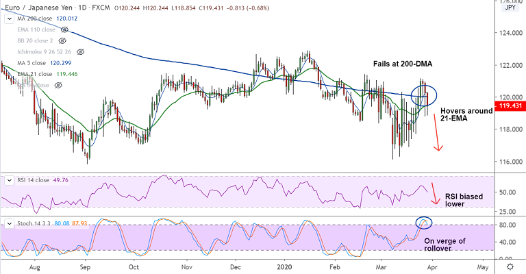 EUR/JPY was trading 0.71% lower on the day at 119.39 at around 10:25 GMT, bias is turning bearish.