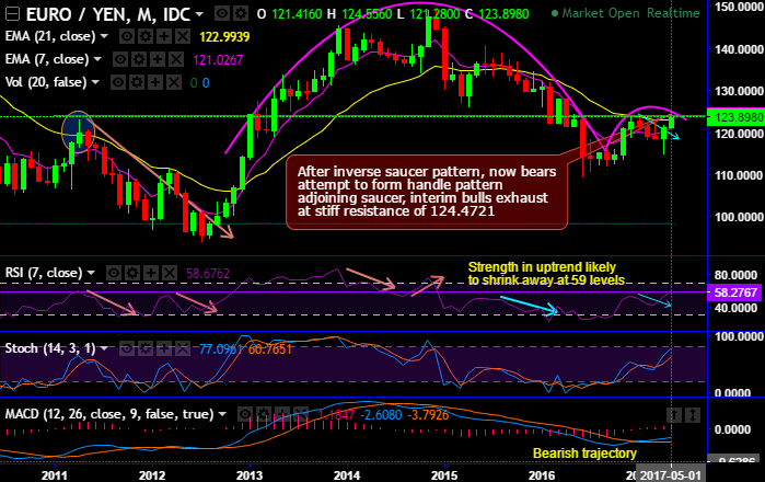 But in the major trend, after inverse saucer pattern now bears attempt to form handle pattern adjoining saucer, interim bulls exhaust at the stiff resistance of 124.4721 (refer monthly charts).