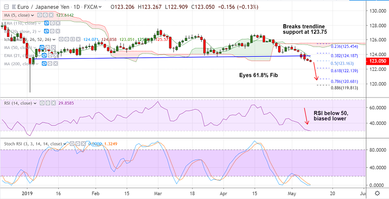- EUR/JPY is extending weakness after breach at trendline support at 123.75.