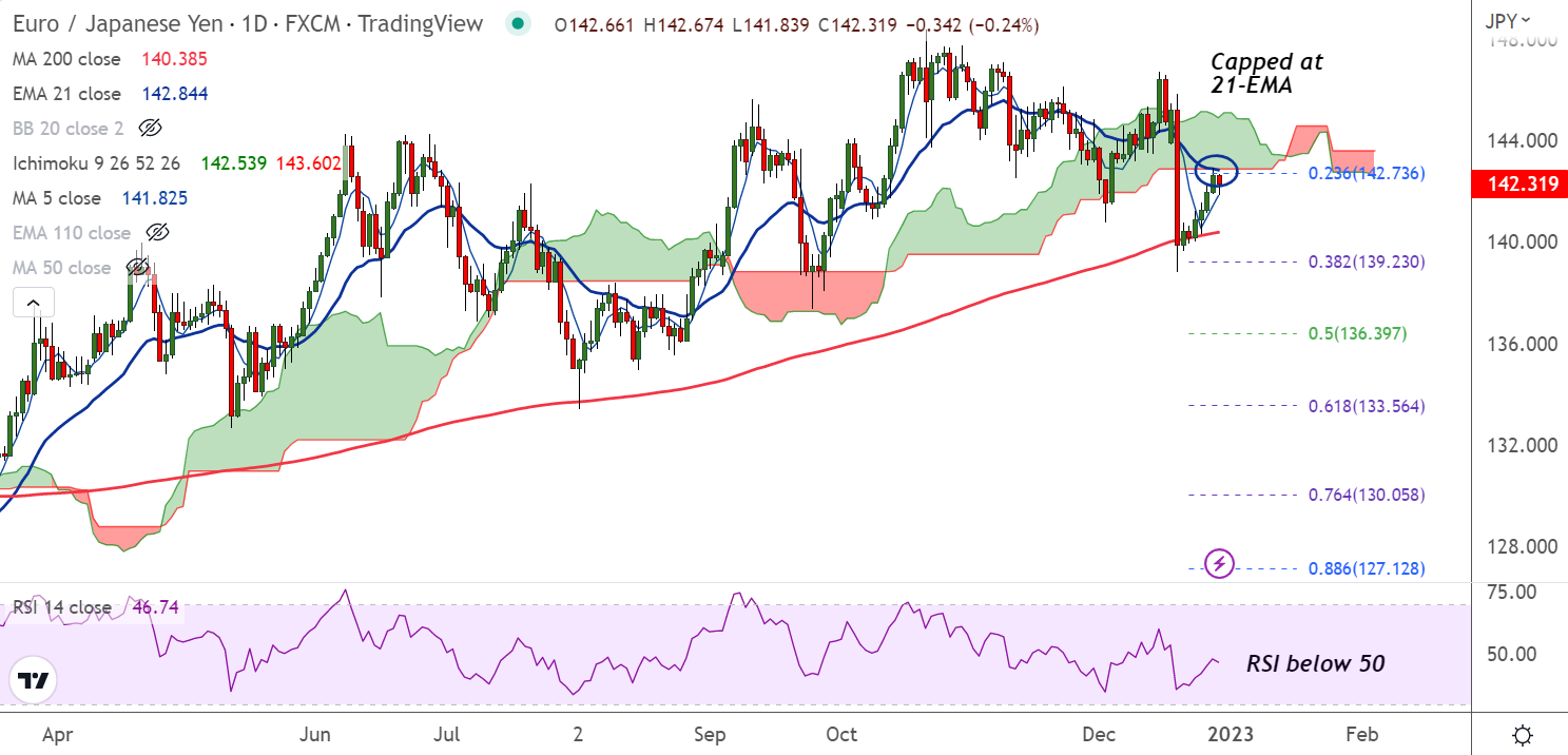 The pair has snapped a 4-day uptrend, finds stiff resistance at 21-EMA and cloud base. Decisive break above required for upside continuation