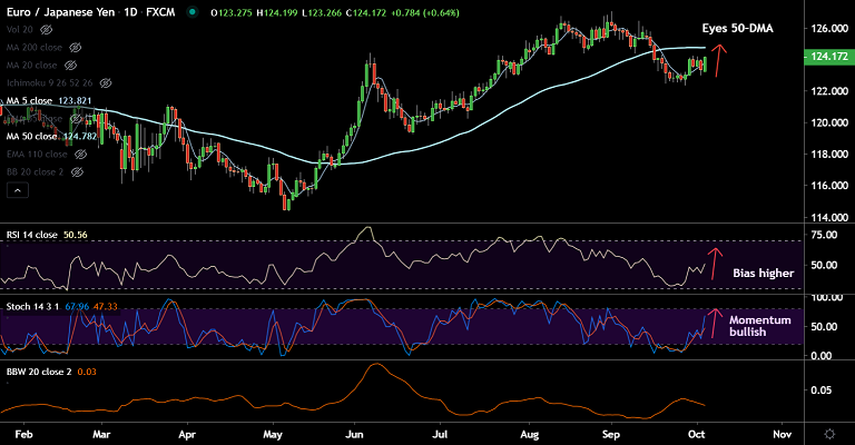 Technical bias for the pair has turned bullish. Stochs and RSI have turned bullish. Pair is set to test 50-DMA resistance at 124.78.