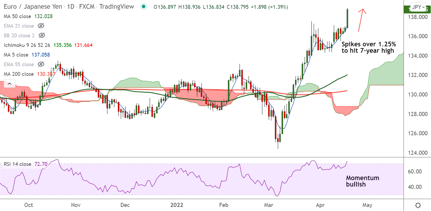EUR/JPY was trading 1.37% higher on the day at 138.75 at around 13:15 GMT.