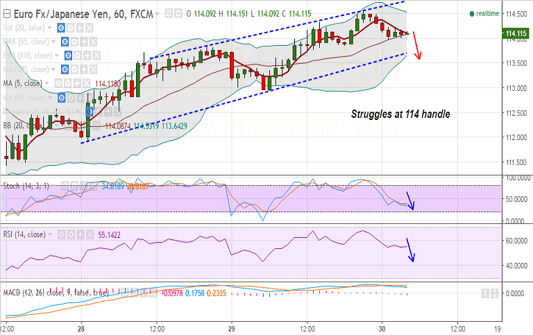 - Hourly charts show downside for the pair, break below 114 could see downside upto 113.52 levels.