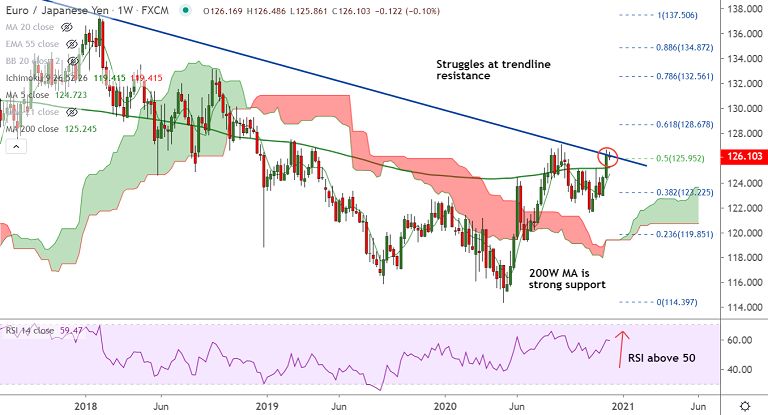 - EUR/JPY struggles at major resistance at falling trendline support at 126.20