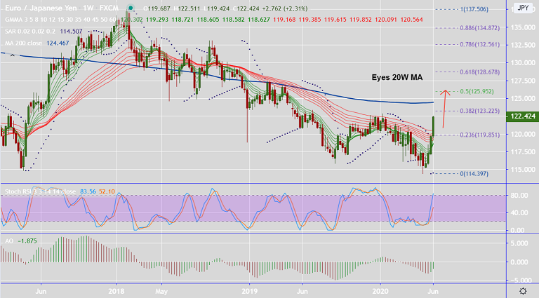 EUR/JPY eyes 2020 high at 122.85. Further upside could see test of 38.2% Fib at 123.22 ahead of 200W SMA at 124.46.