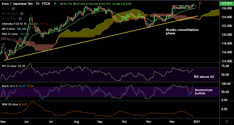 EUR/JPY was trading 0.21% higher on the day at 127.01 at around 07:30 GMT, after closing 0.38% higher in the previous session.