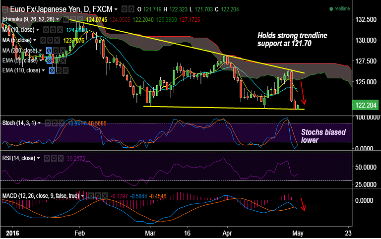 - Technicals on daily charts support downside in the pair. The pair is holding strong trendline support at 121.70 and weakness only on breaks below.