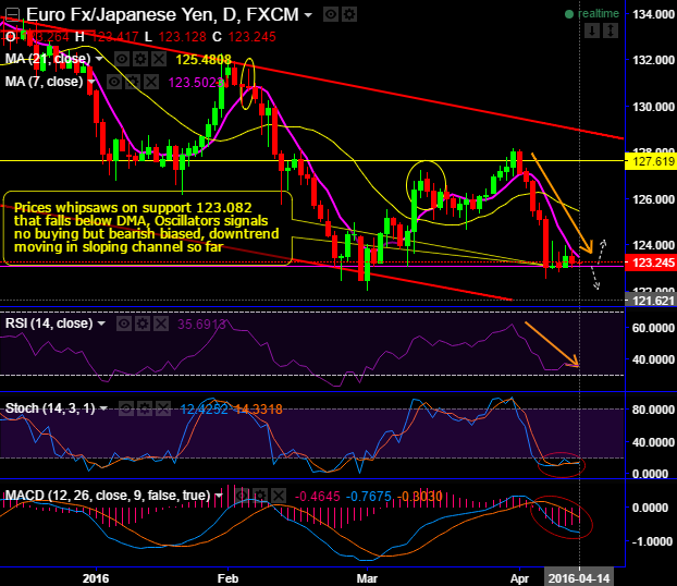 Prices whipsaws on support 123.082 that falls below DMA, Oscillators signals no buying but bearish biased, downtrend moving in sloping channel so far.