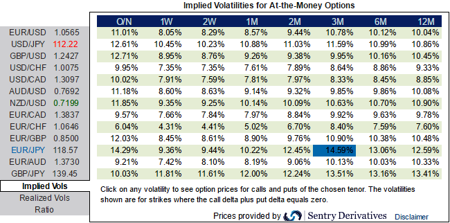 The 3m risks reversals are bidding for higher prices in underlying EURJPY spot FX with downside risks in long run (3m RR highest among G10 space). 1m IVs are shrinking away while 3m IVs rising, we interpret this as the options with a higher IV cost more. This is intuitive due to the higher likelihood of the market ‘swinging’ in your favor. If IV increases and you are holding an option, this is good. Unfortunately, if you have sold an option, it is bad. A seller wants IV to fall so the premium falls. You should also note short-dated options are less sensitive to IV, while long-dated are more sensitive.