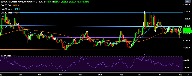 We prefer to take long position on EUR/KRW around 1,328, stop loss at 1,324 and target of 1,357/1,377.
