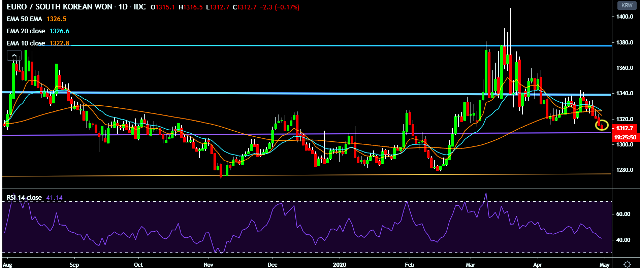 - EUR/KRW is currently trading around 1,312 mark.