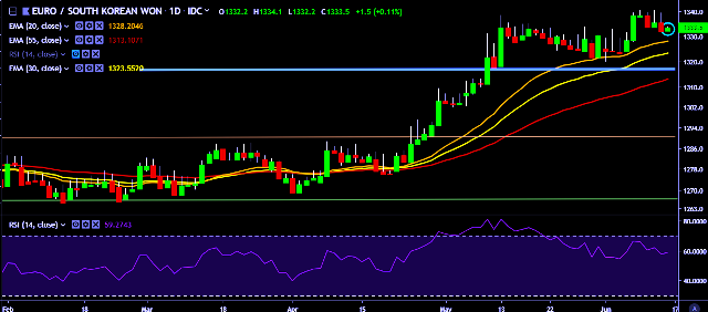 We prefer to take long position on EUR/KRW only above 1,340, stop loss 1,328 and target of 1,358/1,377.