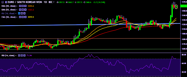 We prefer to take long position on EUR/KRW only above 1,370, stop loss 1,350 and target of 1,392.