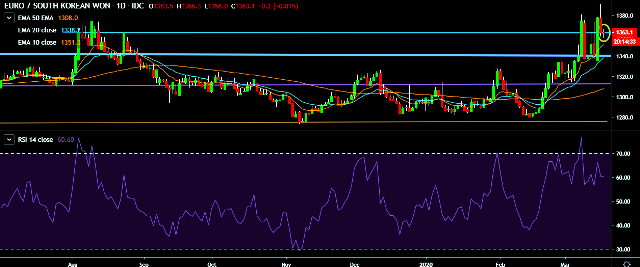 - EUR/KRW is currently trading around 1,361 mark.