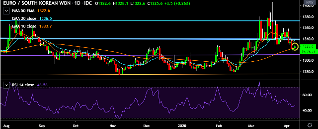 We prefer to take long position on EUR/KRW around 1,324, stop loss at 1,320 and target of 1,337/1,358.