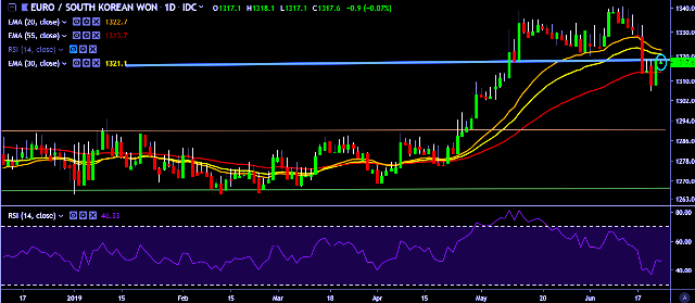 We prefer to take long position on EUR/KRW only above 1,322, stop loss 1,308 and target of 1,340.