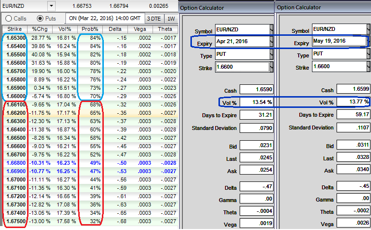 First and foremost, have a look at the EURNZD ATM IVs of 1 and 3 months tenor (at around 13.5-13.75%) which is why we would advocate the below strategy since more likelihood of underlying spot price swings more significantly and ATM instruments to mature in the money on expiration.