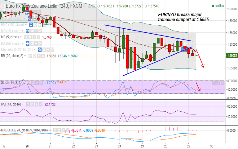 - EUR/NZD is trading a symmetric triangle pattern on 4 hourly charts and has broken below triangle base.