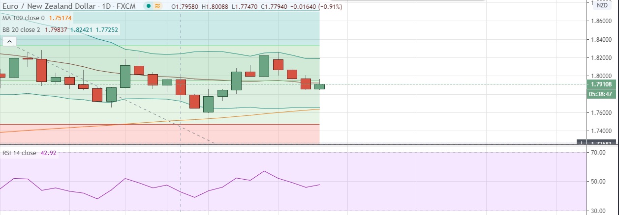 • Strong support is seen at 1.7844 (Daily low) and break below could take the pair towards 1.7649 (Lower BB).