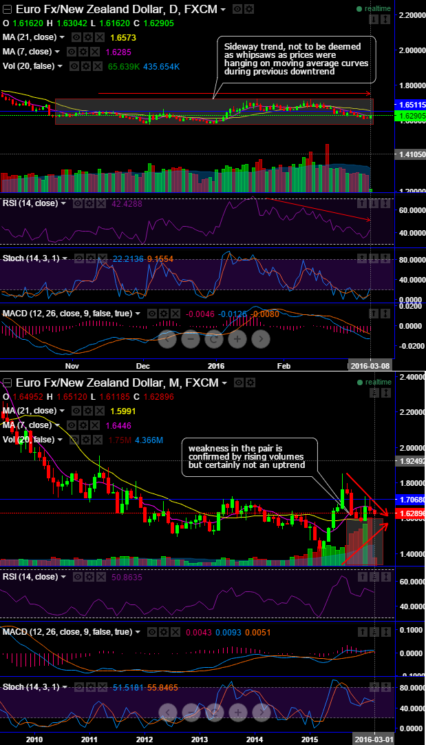 Although intraday sentiments have been slightly bullish, emphasizing ore on short term trend of this pair, it has failed to hold onto the previous rallies and broken crucial supports at 1.6511 levels, today again shows little strength at 1.6162 levels, if it doesn't manage to hold these current levels then that it would again be projected as failures in upswings and may head towards more price declines since various bearish indications even on monthly plotting.
