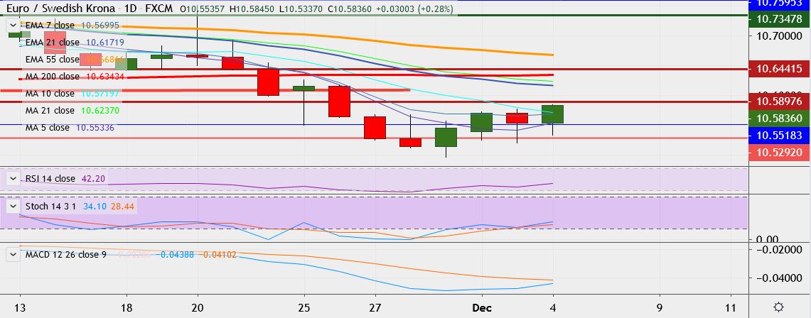 - EUR/SEK trades 0.2 percent up at 10.5835, having hit a high of 10.5845 earlier, its highest since November 26.