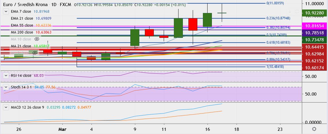 - EUR/SEK trades 0.1 percent up at 10.9380, having hit a high of 11.0010 on Monday, its highest since July 2009.
