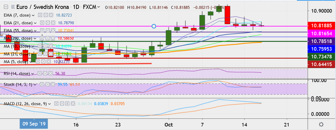 - EUR/SEK trades flat at 10.8200, having hit a low of 10.7936 on Tuesday, its lowest since October 2.