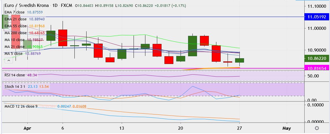 - Immediate resistance is located at 10.8921 (21-EMA), any close above could take it near 10.9085.